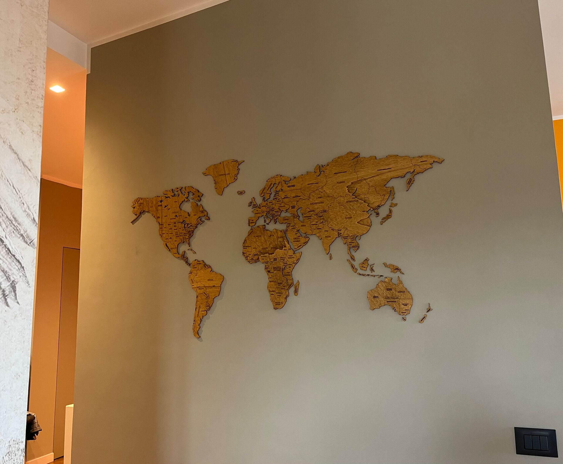 A térképek minden típusa lézervágott és kézzel ragasztott rétegelt lemezlapokból áll. Az országhatárokat, neveket és fővárosokat részletesen bevésik (ahol a hely engedi). A kontinensek tökéletesen illeszkednek egymáshoz, és gyönyörű megjelenést kölcsönöznek az egész térképnek. Az egyes országok öt különböző színben vannak pácolva (plusz a természetes fa színe - pácolatlan).
